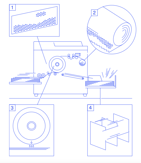 The original is scanned through the machine and a master is created, by means of tiny heat spots on a thermal plate burning voids (corresponding to image areas) in a master sheet. This master is then wrapped around a drum and ink is forced through the voids in the master. The paper runs flat through the machine while the drum rotates at high speed to create each image on the paper.